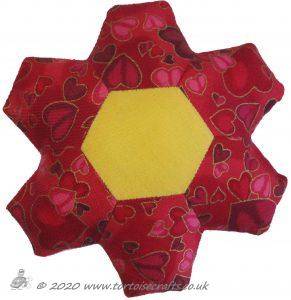 This Hexagon “Pin Cushion” is one of the first things that I teach a new starter to my class. It is the most traditional English form of patchwork worked over papers (EPP), it has a long history and can be seen on quilts dating back centuries.